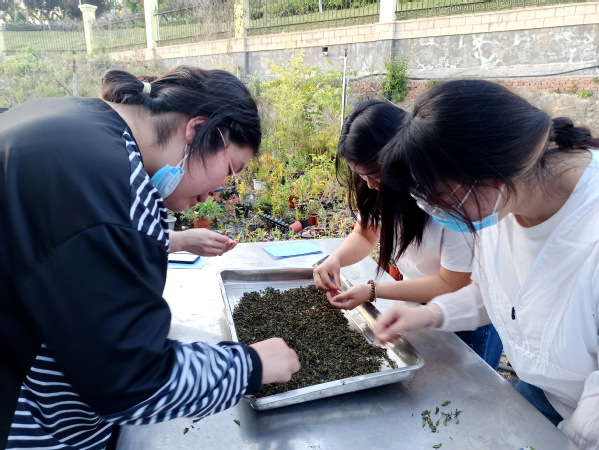 采茶环节结束后,同学们转战来到学校花房,在园艺师傅们的指导下,一步步完成杀青、揉捻、炒干等绿茶加工工序,将采摘的茶叶制成了“成贤春茗”。