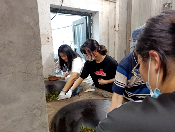 同学们亲手炒制茶叶