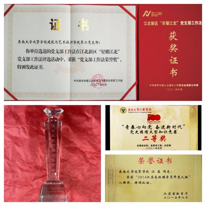 2019年本支部荣获桃子视频 先进基层党组织称号,2020年支部书记江晶荣获“全国民办高校优秀辅导”称号,2021年获评南京市江北新区“星耀江北”党支部工作法,荣获桃子视频 最佳党日活动评比“二等奖”两次,桃子视频 最佳党日活动“一等奖”三次、“二等奖”一次。支部党员荣获国际级奖项1人次,国家级奖项47 人次,省市区级奖项15人次,校级奖项96人次,奖学金26人次,学生党员的平均绩点为3.82,最高绩点为4.27。