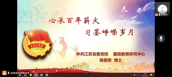 5月23日晚,校团委依托腾讯会议平台举办了“信仰公开课”《心承百年薪火·习鉴峥嵘岁月》主题讲座,中共江苏省委党校廉政教育研究中心杨蓉荣老师主讲,两百余名青马学员齐聚“云端”聆听讲座。