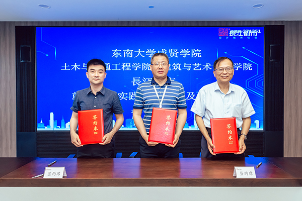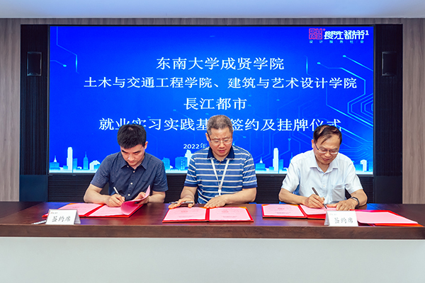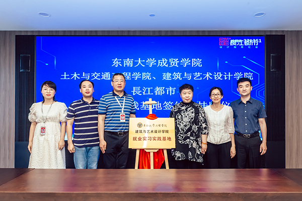 人力资源部经理刘友存则向与会领导、老师介绍了从2013年起入职长江都市的19位成贤校友的职业发展情况,他们在结构设计、建筑设计、室内设计、环境设计等多个岗位,展现了成贤学子扎实的专业功底和良好的综合素质,为企业的快速发展贡献了自己的青春智慧。科研技术管理部经理韦佳以《坚持“双创”战略驱动持续发展——长江都市设计创优与科技创新》为主题,介绍了长江都市从传统的设计企业向工程设计与科技创新相集合的科技企业的转型之路,介绍了企业近年来在绿色建筑与装配式建筑、办公建筑的创新应用、科研课题与技术研究等方面所取得的成果。随后土木与交通工程学院院长郭正兴、建筑与艺术设计学院党总支副书记邵叶鑫,分别代表两个学院与南京长江都市建筑设计股份有限公司总经理董文俊签订了《就业实习实践基地协议书》并挂牌“桃子视频 就业实习实践基地”。