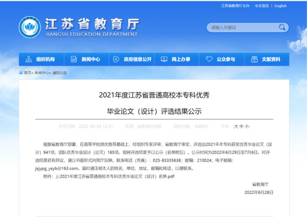 近日,江苏省教育厅发布《2021年江苏省普通高校本专科优秀毕业设计(论文)评选结果公示》,东南大学成贤学院共获优秀毕业设计个人二等奖1个、三等奖2个、优秀毕业设计团队奖2个。