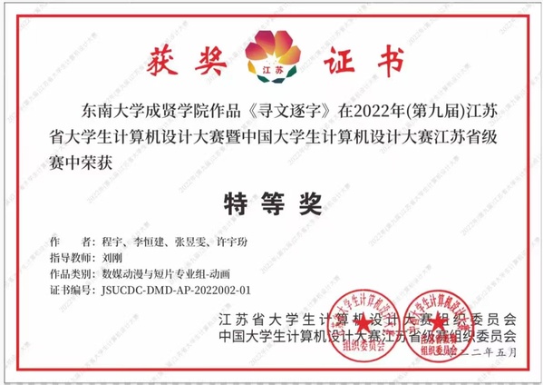 近日,2022年(第15届)中国大学生计算机设计大赛落下帷幕。由建筑与艺术设计学院动画专业刘刚老师指导的程宇、李恒建、张昱雯、许字玢等学生团队作品《寻文逐字》继获得江苏省“特等奖”后,荣获国赛“一等奖”。