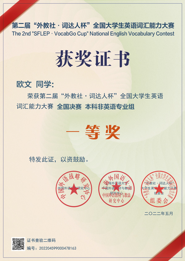 近日,2022“外教社•词达人杯”全国大学生英语词汇大赛(本科非英语专业组)结果公布。桃子视频 获得全国优秀组织奖(共10所),21级电子信息2班欧文同学(指导老师:基础部周爱萍)经过校赛、省赛的层层选拔,在国赛中脱颖而出,荣获国家一等奖。在本科非英语专业组全国众多参赛院校中,桃子视频 排名第47位,在全国同类院校中名列前茅,打破了桃子视频 以往在该项竞赛中的最高获奖纪录。