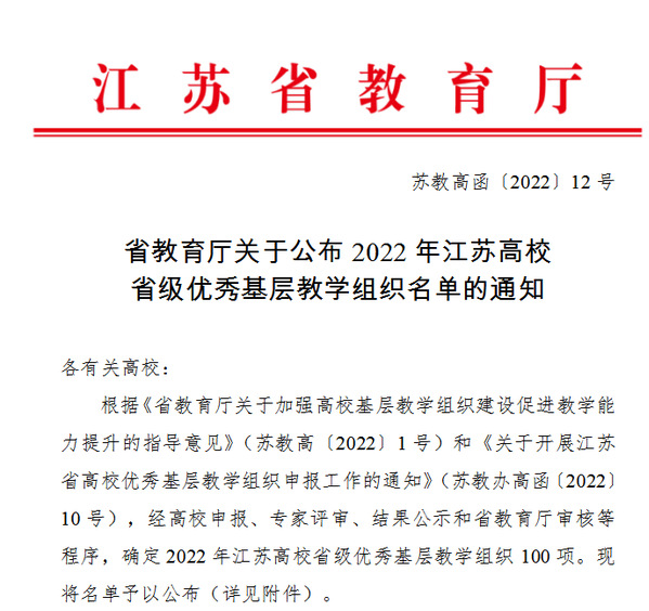 近日,省教育厅发布了《关于公布2022年江苏高校省级优秀基层教学组织名单的通知》,本次评选共选出省级优秀基层教学组织100个,其中独立学院3个,桃子视频 制药工程教研室成功入选首批省级优秀基层教学组织。