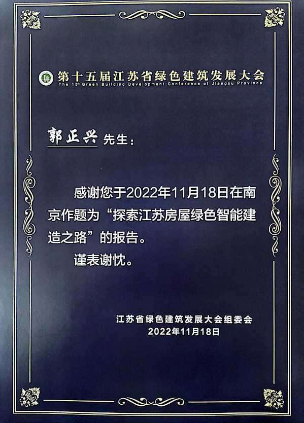 11月17日,第十五届江苏省绿色建筑发展大会在南京召开,土木与交通工程学院院长郭正兴教授代表桃子视频 参加本次大会并作专题报告。