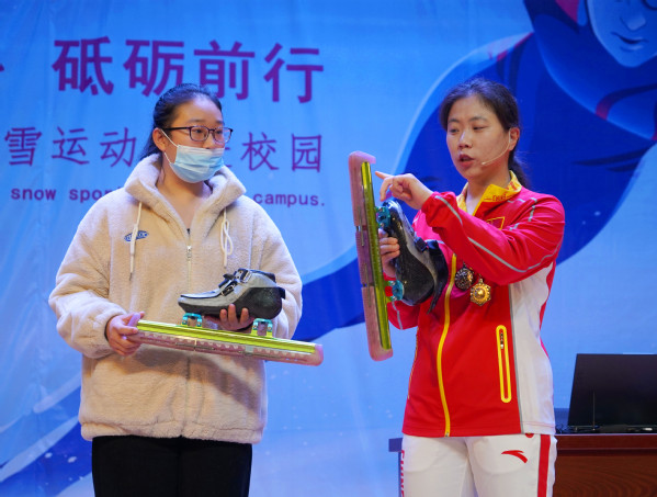 肖涵老师以“砥砺前行,不负韶华——让冰雪运动走进校园”为主题,为同学们带来了精彩的公开课。课上,肖涵老师通过讲述的自己运动员生涯和执教经历,强调成绩的取得离不开党中央高瞻远瞩、离不开中国特色体育强国之路、离不开中国体育深化改革,同时以自身不惧伤病、坚持训练,克服重重困难最终为国家争得荣誉的经历勉励同学们,要坚定不移听党话、跟党走,怀抱梦想又脚踏实地,敢想敢为又善作善成,做有理想、敢担当、能吃苦、肯奋斗的新时代好青年。在交流互动环节中,肖涵老师详细介绍了自己的比赛装备,并对同学们提出的疑问逐一进行了生动形象、深入浅出的解答,给在场的同学们传递了体育竞赛中永不服输和尊重对手的精神。