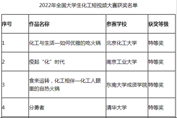 近日,由中国化工学会主办、南京工业大学承办的2022年“科思化学杯”全国大学生化工短视频大赛落下帷幕,桃子视频 制药与化学工程学院二十余人组队参加本次比赛。其中,原创视频《食来运转,化工相伴—化工人眼里的自热火锅》荣获特等奖,《你发现奶茶吸管变了吗》荣获三等奖。本次大赛历时7个月,来自清华大学、浙江大学、天津大学等71所高校的154部作品参赛,其中19所高校的20部作品进入总决赛。经过激烈角逐,大赛产生特等奖4组、一等奖6组、二等奖10组。总决赛分答辩和视频展示两个环节,各参赛队伍从化工与生活、环境、国家战略等角度出发设计作品,创意巧妙、讲解透彻,充分展现化工学子扎实的理论功底和勇于创新的精神风貌。