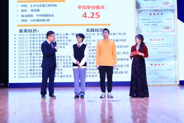 “旌旗作响,汇聚新春奋进力量;旗开得胜,谱写青春至善华章”,大会在舞蹈“旗开得胜”的激情演绎中拉开帷幕。本次大会共分为两个篇章,分别是“见贤思齐”与“勉悟精习”。在第一篇章“见贤思齐”中,省级先进个人钱思雅、张吴桐与省级先进集体19级工程造价2班的展示为在座学生树立了优秀榜样,激励同学们学习先进、发奋图强。舞蹈"天天向上"也展现出土木与交通工程学院学生的活力与精神追求。