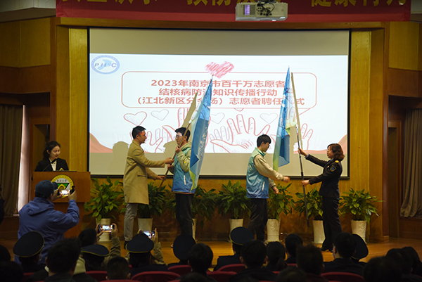 由国家卫健委、中国疾病预防控制中心、中国健康教育中心联合发起的“百千万志愿者结核病防治知识传播行动”已开展多年,江北新区公共卫生服务中心的结核病防治工作者代表吴玉蕾医师在会场宣读志愿者倡议。在现场授旗仪式环节,南京市卫生监督所学校卫生监督科科长戴心声、江北新区公共卫生服务中心项目管理科科长洪镭为桃子视频 志愿者代表授旗,桃子视频 志愿者将和其他高校志愿者携手并肩,将结核病防治知识的传播行动和志愿者公益精神持续进行下去。