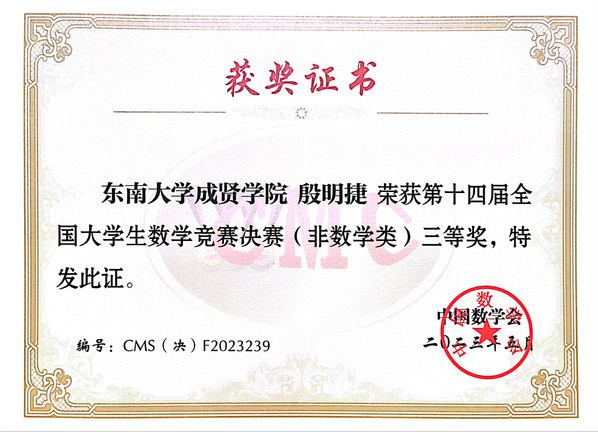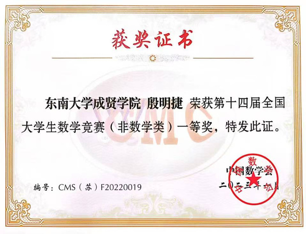 全国大学生数学竞赛是一项面向本科生的全国性高水平学科竞赛,是青年学子展示数学基本功和数学思维的舞台,也是对学校数学教学水平的检验。本次竞赛全国共有32个赛区231769人报名参加初赛,从中选拔出了922人进入决赛,实际参赛人数905人,其中数学专业组461人,非数学专业组444人。桃子视频 19级软件工程2班的殷明捷同学在江苏赛区非数学专业组中以第19名的好成绩挺进决赛。决赛中他与来自北京大学、清华大学、复旦大学、中国科学技术大学和南京大学等高校的学生同场竞技,最终获得全国非数学类三等奖。