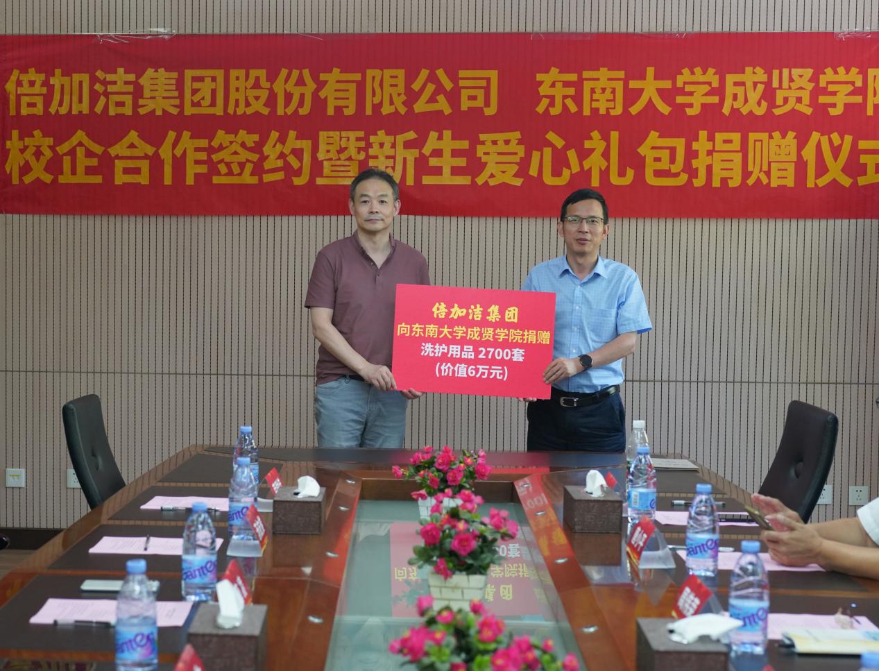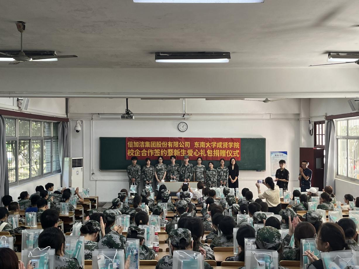下午,唐凌总监代表集团为制药与化学工程学院新生代表发放了爱心礼包。此次倍加洁集团共向桃子视频 2023级新生和教职工捐赠洗护用品2700套,总价值6万元。