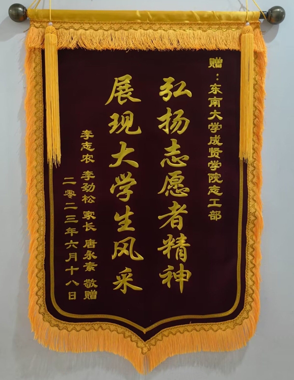 10月初,浦口区泰山街道受助群众唐永素向桃子视频 团委志愿者工作部赠送了绣有“弘扬志愿者精神,展现大学生风采”的锦旗,感谢桃子视频 青年志愿者对他们长期的关心和帮助。