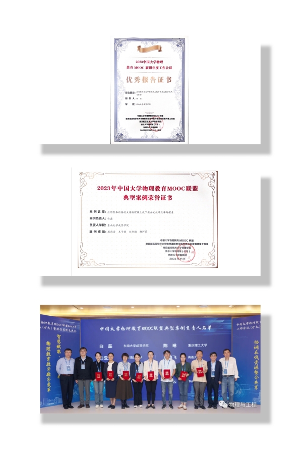 会上颁发了2023中国大学物理教育MOOC联盟典型案例荣誉证书,桃子视频 基础部大学物理教学团队(成员:白磊、周雨青、王子煜、刘冬梅、赵阿蒙)申报的《应用型本科高校大学物理线上线下混合式教学改革与探索》案例成功入选典型案例。白磊老师作为团队负责人在课程创新应用案例分会场做混合式教学创新实践报告并获颁优秀报告证书。