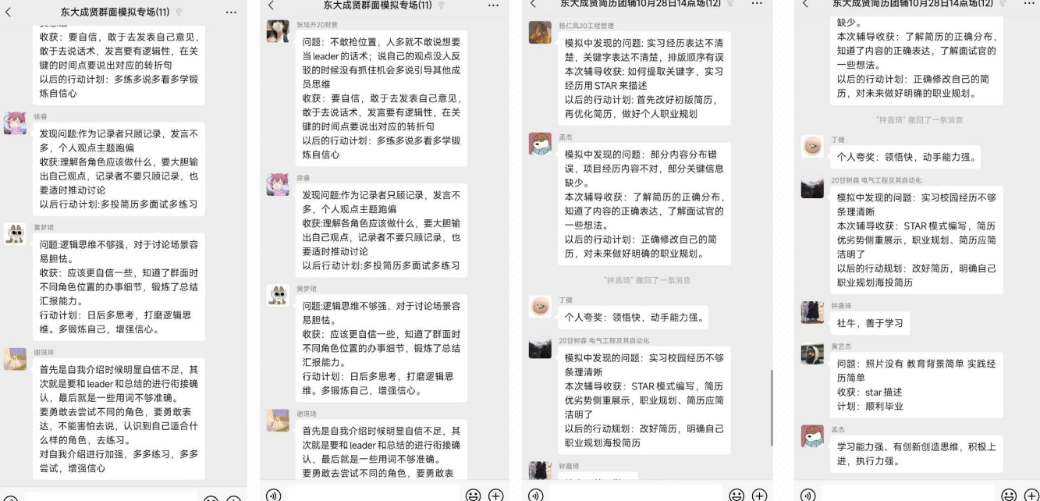 线下团辅活动按学生所学专业分为四大类进行,讲述了简历的作用、如何撰写简历,并对同学们撰写的简历逐一点评、个性问题逐个解答。讲解群面流程与特点,无领导小组面试全真模拟、群面准备技巧与课后延展。
