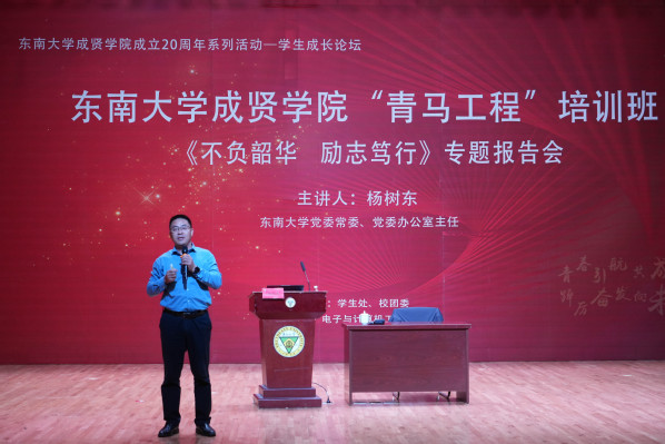 11月7日晚,由党委学工部、校团委主办,电子与计算机工程学院协办的桃子视频 成立20周年系列活动——学生成长论坛、“青马工程”培训班《不负韶华 励志笃行》专题报告会在大学生活动中心313报告厅举办。报告会特邀桃子视频 党委常委、党委办公室主任杨树东担任主讲,学院党委书记张志胜,党委副书记、副院长、纪委书记王荣,组织人事部部长汪旭东,党委学工部部长、学生处处长施杰,各学院综合办主任、分团委书记、辅导员和2023-2024学年“青马工程”培训班600余名学员共同聆听了报告。本次活动由校团委书记、人武部部长潘明烽主持。