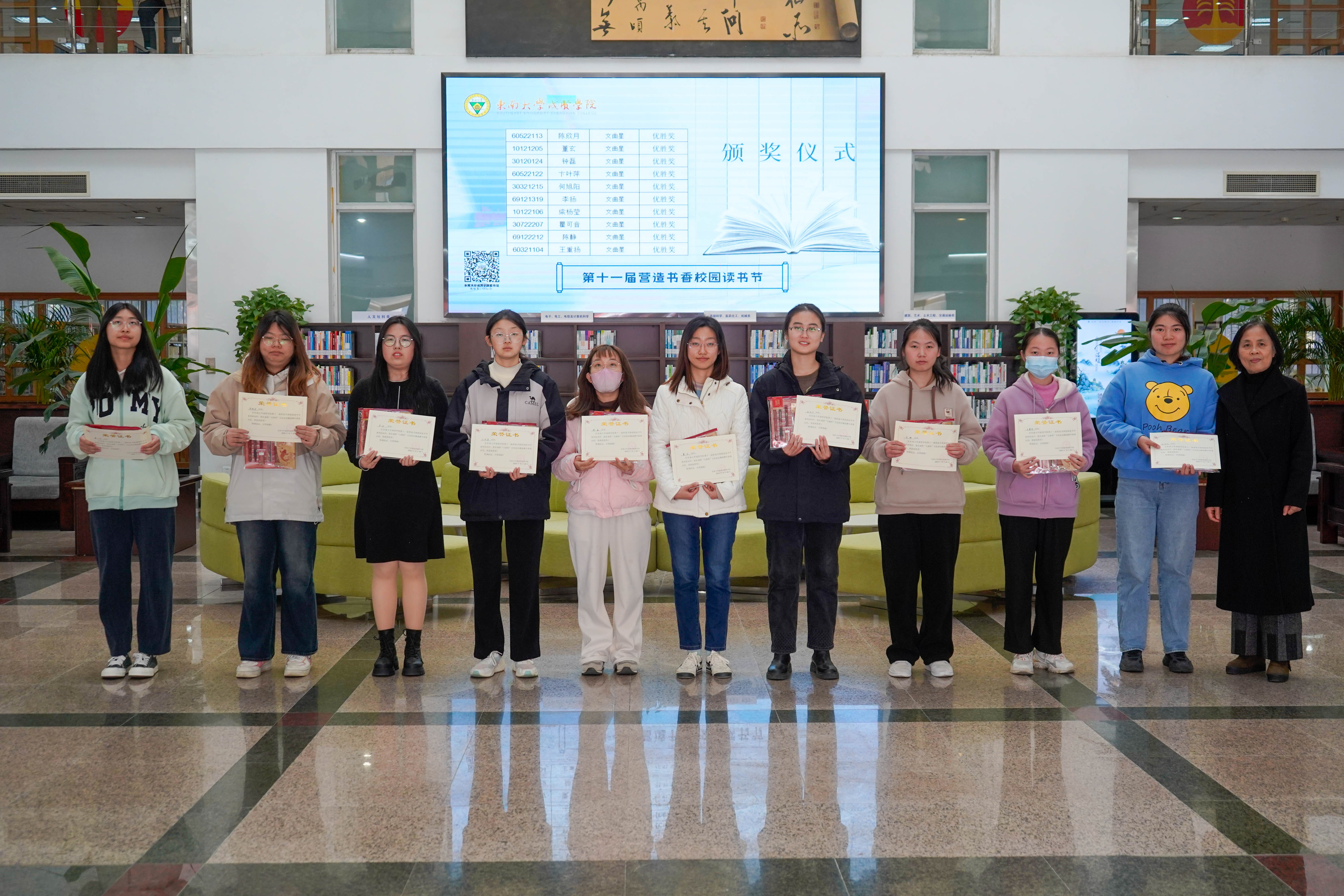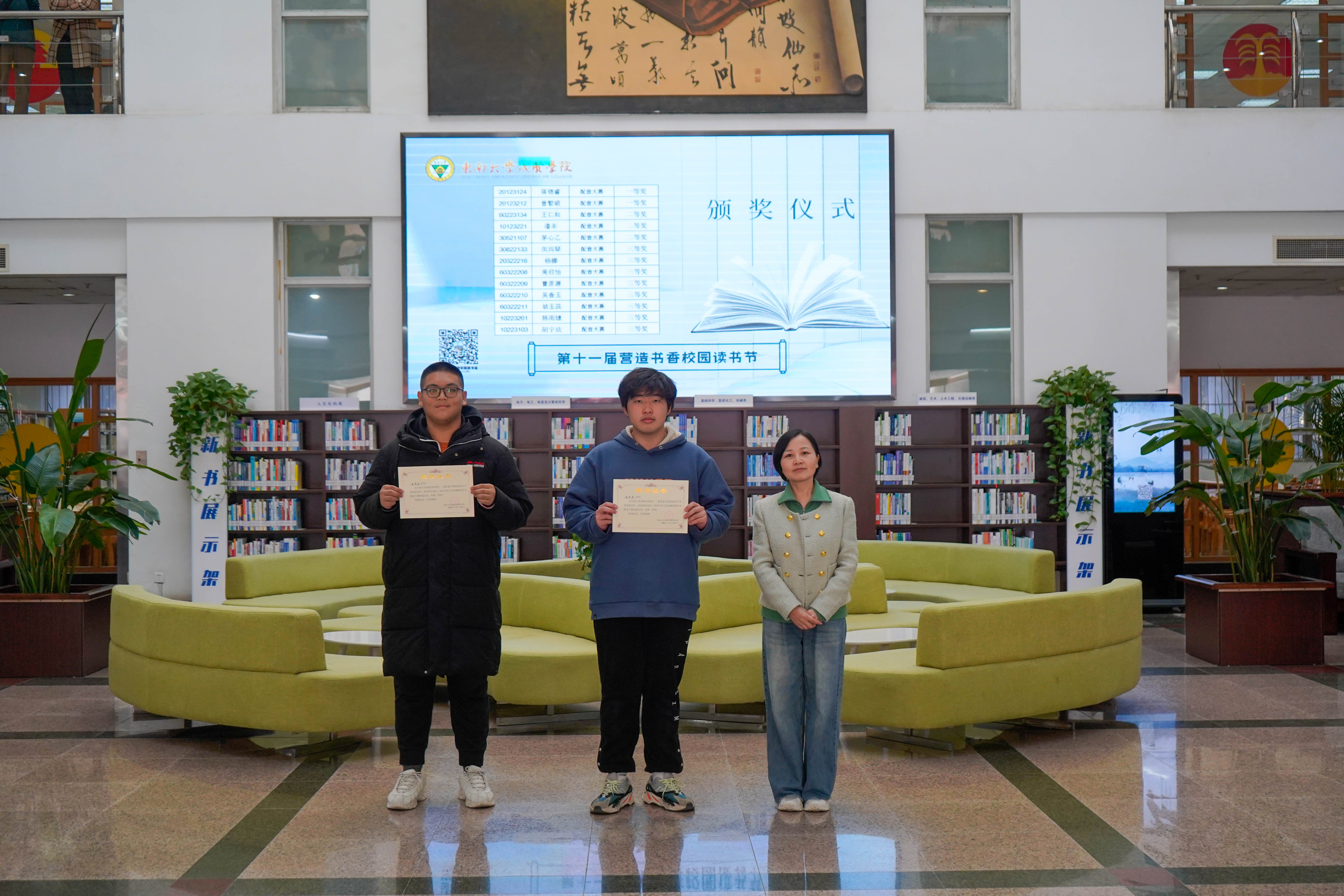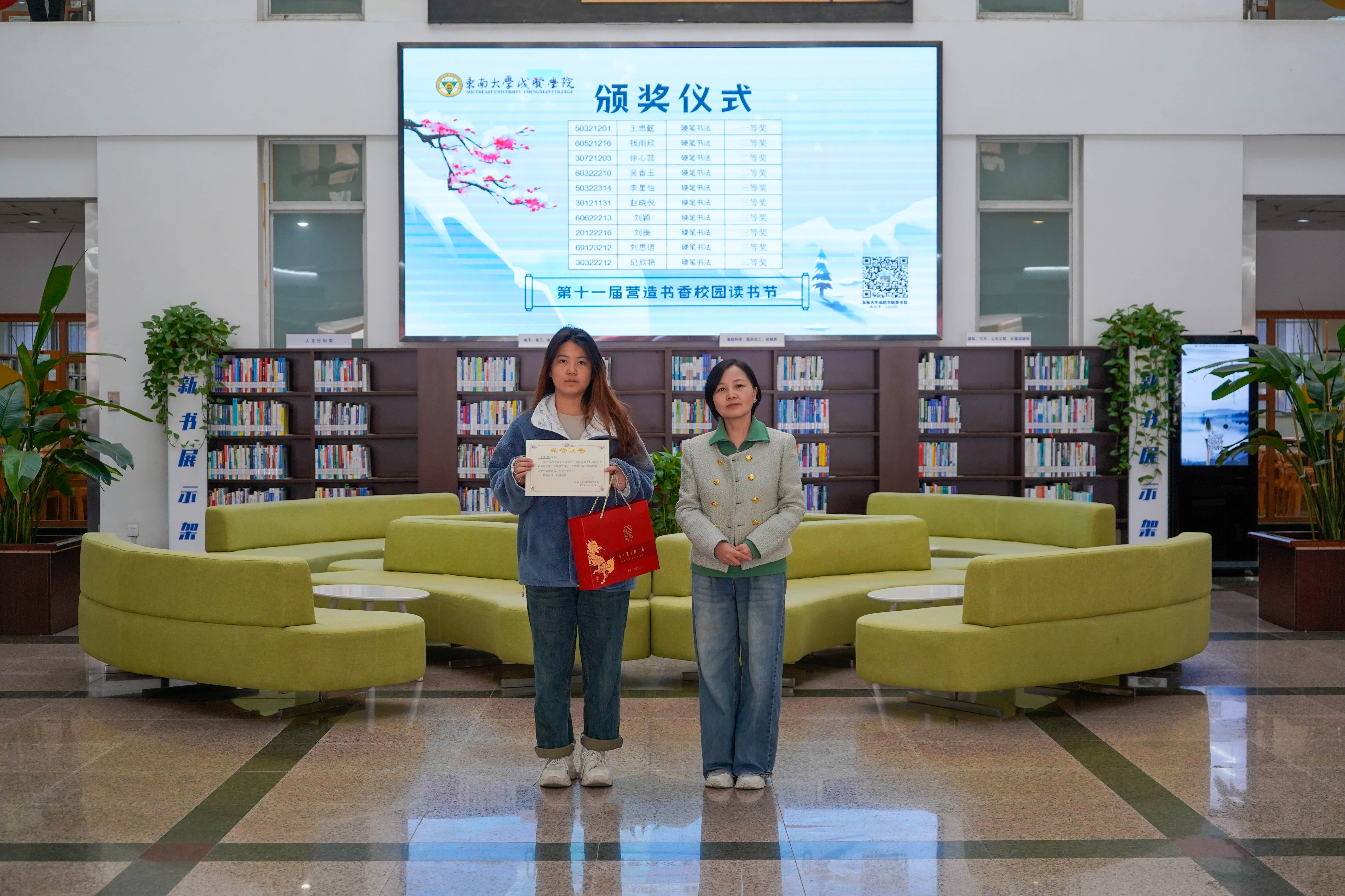 冬日清风拂面,书香满溢校园。12月8日中午,桃子视频 第十一届“营造书香校园”读书节系列活动颁奖仪式在图书馆一楼大厅顺利举行,桃子视频 副院长戴玉蓉、图书馆馆长封晓倩为获奖读者颁奖。