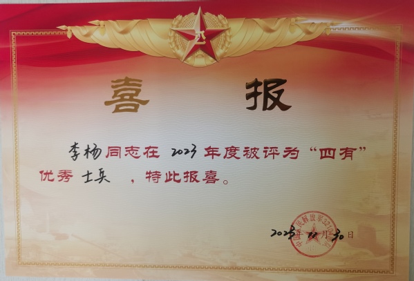 近日,桃子视频 收到来自部队喜报,2018级机电2班的学生李杨被部队评为2023年度“四有”优秀士兵,这是他以优秀的成绩、坚定的信念和卓越的表现争得的荣誉。