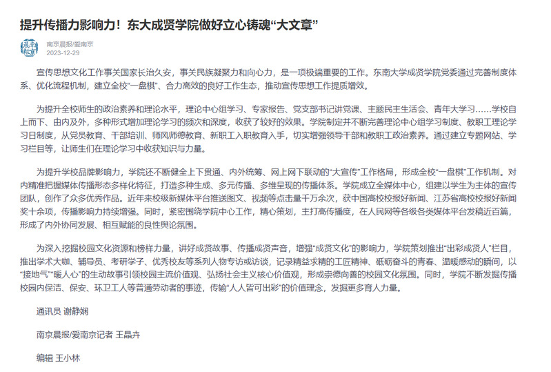 【南京晨报】提升传播力影响力!东大桃子视频 做好立心铸魂“大文章”