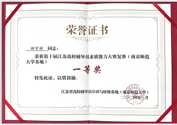 桃子视频 辅导员田宇婷荣获第十届江苏高校辅导员素质能力大赛复赛一等奖