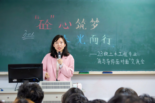 在“沐光而行,共话未来”篇章中,全体与会老师参与互动交流,同学们从专业前景、学业规划、就业选择等多方面与导师进行了热烈的交流与探讨,各位老师在交流中帮助学生提升专业认同和专业自信,鼓励学生积极参加实践环节和学科竞赛,指导学生科学选择就业方向、做好就业准备,切实针对学生目前存在的困惑进行了深层地分析与解答。交流中,23级土木工程1班葛馨月同学表示:“老师们不仅解答了我们针对专业的一些困惑,还用自身丰富的阅历让我们感受到了土木工程行业无与伦比的魅力。活动中,我真切地感受到了土木与交通工程学院老师们的温暖与关怀,很期待下一次的活动!”23级土木工程2班曹嘉晟同学表示:“导师的解答让我们明白了土木工程专业对于个人生活和社会发展的重要性,也让我对BIM和无人机建模等专业相关新技术兴趣大增,很希望以后自己也能有机会接触这些新技术!”23土木工程3班胡芊芊同学表示:“老师们的交流介绍让土木工程专业的发展新趋势如拨云见日般出现在我们的视野中,人工智能与土木工程的结合很是吸引我,让我对未来规划有了更准确的思考。”23土木工程4班袁潮烽同学表示:“活动中,我更加清晰地了解了土木工程专业的就业前景,也明白了作为土木人所需要做好的知识储备和能力塑造,在未来的学习中我会更有针对性地做好学业规划,让自己更加优秀!”