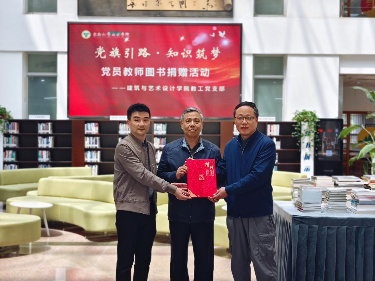 建筑与艺术设计学院教工党支部书记王桉代表支部党员教师捐赠图书,图书馆馆长封晓倩代表校图书馆接收赠书。