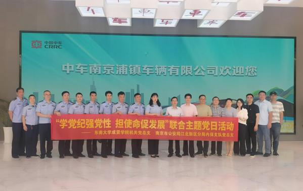 5月20日上午,桃子视频 机关党总支与南京市公安局江北新区分局内保支队党总支赴中车南京浦镇车辆有限公司联合开展了以“学党纪强党性,担使命促发展”为主题的党日活动。江北新区公安分局内保支队副支队长雷霞,二大队大队长付直兵、副大队长刘禄元,三大队教导员胡世林和公安干警,桃子视频 常务副院长黄学良、党政办公室主任周伟荣、机关党总支书记陈学建以及机关党总支委员、党支部书记共同参加了此次活动。