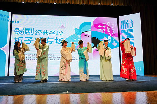 锡剧作为国家级非物质文化遗产的璀璨瑰宝,不仅是江苏戏曲的璀璨明星,更是华东地区三大剧种之一,享有“锡老大”的盛誉。在演出前的导赏环节,主持人和青年表演艺术家向观众介绍了剧种和剧目。随后,三场经典名段《珍珠塔·赠塔》、《梵王宫·挂画》、《杀狗劝妻》轮番上演,赢得师生的热烈掌声。剧目表演间还巧妙安排了唱腔教学、锡胡演奏、戏服展示和互动环节,让学生们亲身感受锡剧的魅力,深入了解这一太湖流域的传统艺术。