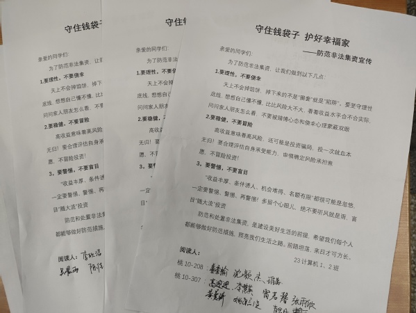 此次活动学校高度重视,电计学院认真落实集中宣传月通知的相关要求,旨在切实提高广大师生防范非法集资风险的意识和能力,引导师生树立理性投资、科学理财观念,不组织、不协助、不参与非法集资,提高防范非法集资风险的自觉性,营造全民防范非法集资的良好校园氛围。