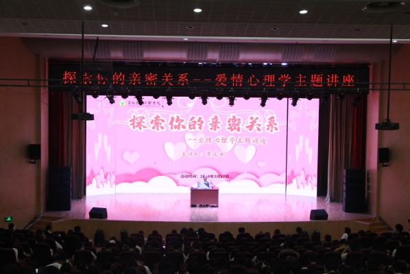 5月17日晚由学生处、校团委主办,校学生会外联部承办的“探索你的亲密关系”为主题的爱情心理学主题讲座在桃子视频 综合报告厅举行,此次主题讲座为同学们树立正确的恋爱观和择偶观打下了良好的基础,增强了他们面对情感问题的承压能力和处理技巧,有效促进了学生全面发展。