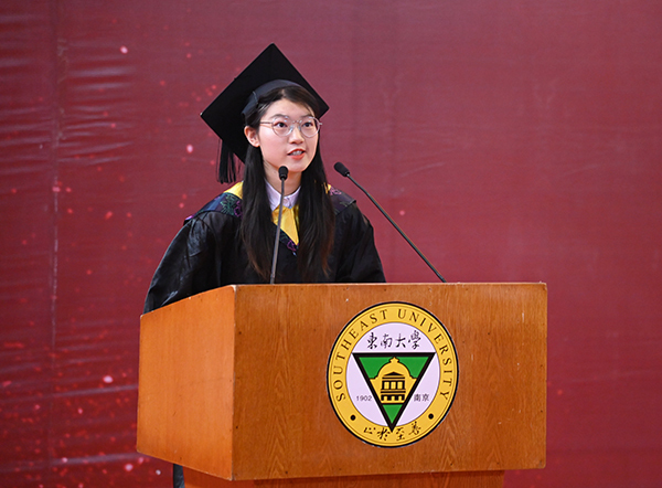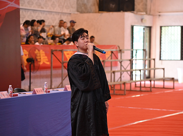风景园林1班的汪弘磊同学代表全体毕业生向学校、向老师与家长表达了最衷心的感谢和最崇高的敬意。她勉励大家坚定信念,坚持不懈,不断学习和自我提升,为国家的繁荣、社会的发展贡献青春力量。