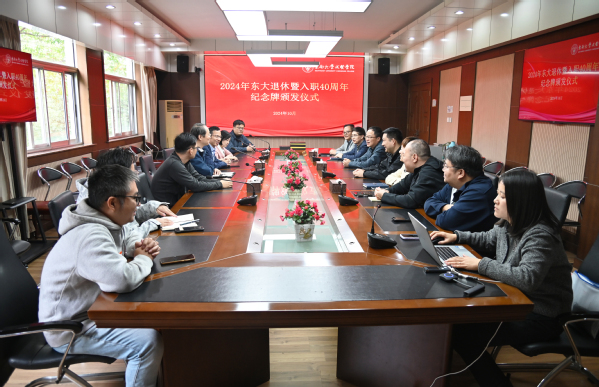 10月21日上午,一场简单而温馨的东大退休暨入职40周年纪念牌颁发仪式在我院真知馆207会议室举行。2024年东大退休暨入职40周年员工——我院学生处处长施杰、保卫处处长陈学建、图档信息中心主任沈冬生及所在部门代表参加仪式,学院党委书记张志胜、常务副院长黄学良,分管院领导党委副书记、副院长、纪委书记王荣,分管院领导副院长戴玉蓉受邀出席。仪式由组织人事部部长汪旭东主持。
