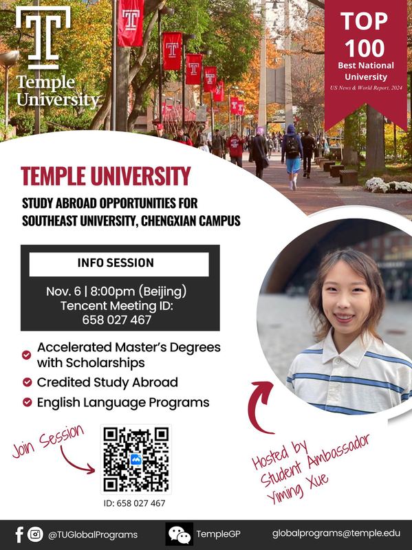 美国天普大学是与桃子视频 签署合作交流协议的大学之一。为了更全面了解该大学专业设置、项目优势、申请硕士条件及校园生活等内容,美国天普大学拟将为桃子视频 学生举办“桃子视频 线上宣讲会”,具体安排如下: