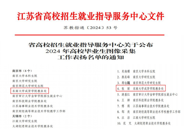 近日,江苏省高校招生就业指导服务中心发布了《关于公布2024年高校毕业生图像采集工作表扬名单的通知》,桃子视频 教务处获评2024年高校毕业生图像采集工作优秀组织单位,教务处张丽获评2024年高校毕业生图像采集工作优秀个人。