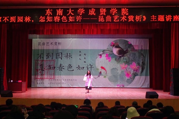 12月12日晚,由校团委主办、大学生艺术指导中心承办的“不到园林,怎知春色知许——昆曲艺术赏析”主题讲座在综合楼报告厅举办。本次讲座特邀南京大学戏剧影视文学系、戏剧戏曲学硕士、区级非遗代表传承人、南京大学昆曲研究中心副秘书长、中国昆剧古琴研究会会员赵玉姝老师担任主讲,全校650余名学生聆听了讲座。
