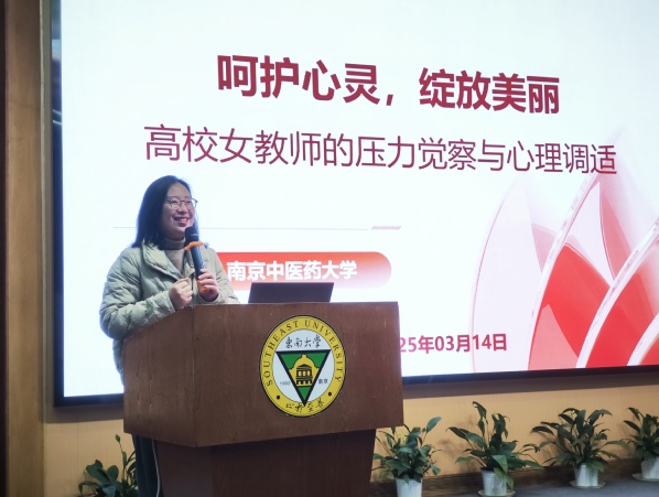 3月14日下午2点,由南京中医药大学郑铮副教授主讲的“呵护心灵绽放美丽——高校女教师的压力觉察与心理调适”专题讲座在真知馆报告厅准时开讲。郑铮副教授凭借深厚的专业知识,通过心理画认识自身的心理压力现状,了解压力对心身健康的影响,学会缓解压力、调适情绪的心理学方法,为女教职工们上了一堂生动且极具价值的心理健康课。讲座后,工会为参会人员提供了精致美味的茶点,让女教职工们在学习知识的同时,也能稍作休憩,享受惬意时光。