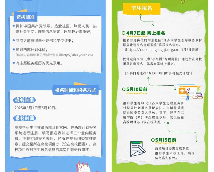 志愿点亮乡野,青春筑梦振兴。2025年“西部计划”“江苏大学生志愿服务乡村振兴计划”志愿者招募火热进行中,校团委积极开展校地定向共建,全方位、多渠道推进招募宣传工作,教育和引导桃子视频 应届毕业生将个人理想有机融入国家西部与基层建设,让他们深刻认识到投身“西部计划”“江苏大学生志愿服务乡村振兴计划”不仅是个人成长的契机,更是时代赋予的使命担当。在基层的广阔天地中,以青春之我、奋斗之我,为乡村振兴和西部发展添砖加瓦,让青春在党和人民最需要的地方绽放绚丽之花。