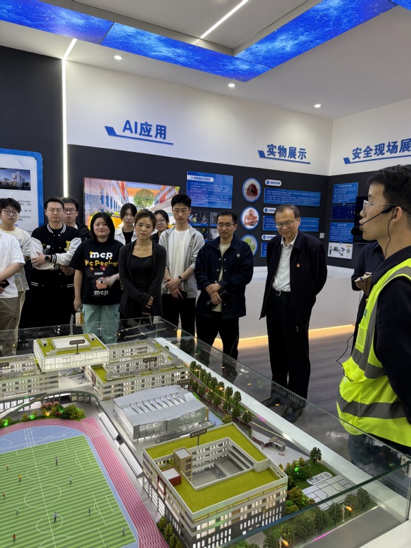 在中建三局项目团队的陪同下,师生们深入了解了南京市第二十九中学新校区建设工程的总体规划与关键技术特点。项目整体采用装配式框架结构,其中教学综合楼B区与国际交流中心兼具剪力墙结构,大幅提升了建筑的抗震性能;风雨操场与食堂则采用了钢木张弦梁结构设计,极大体现了绿色建造和可持续发展的理念。这些技术亮点充分展示了智能建造在提高效率、降低成本、绿色环保等方面的显著优势。