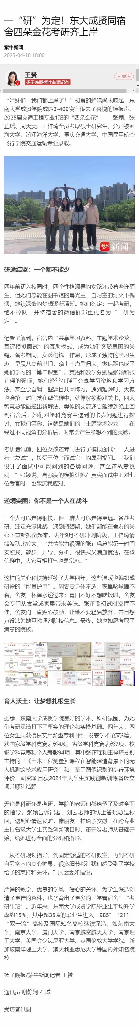 【扬子晚报 紫牛新闻】一“研”为定!东大成贤同宿舍四朵金花考研齐上岸