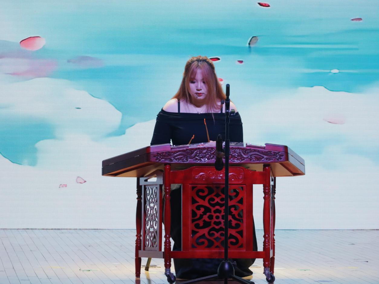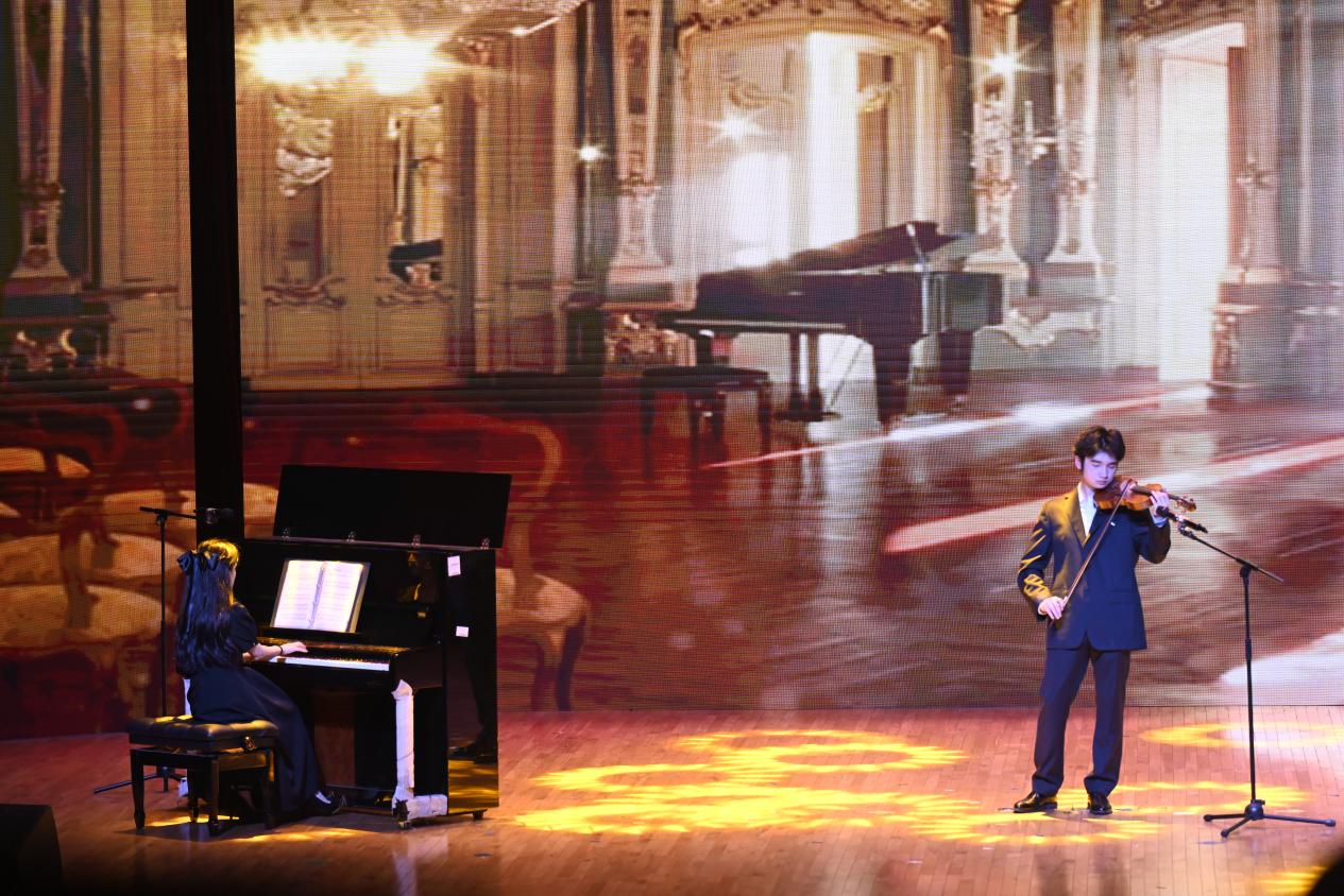 民乐合奏《寄明月》率先登场,丝竹管弦交织,似将朦胧月色与缱绻情思融入旋律,带领观众踏入诗意的月夜幻境。古筝独奏《定风波》中,演奏者指尖起落间,古朴的琴音裹挟着旷达豪情,演绎出 “一蓑烟雨任平生” 的洒脱。竹笛曲《姑苏行》婉转悠扬,笛声如潺潺流水,勾勒出苏州园林的典雅与江南水乡的温婉。扬琴独奏《红河的春天》旋律明快热烈,清脆的扬琴声仿佛奏响了红河两岸万物复苏的生机。古筝重奏《采薇》以灵动多变的节奏,重现了《诗经》中戍卒的思乡之情,琴音如诉。二胡合奏《战马奔腾》气势雄浑,弓弦震颤间,万马嘶鸣、驰骋疆场的壮阔画面跃然眼前。小提琴重奏《一步之遥》与《笼》风格迥异,前者探戈节奏热情奔放,后者旋律细腻深沉,展现出弦乐的多样魅力。钢琴独奏《华尔斯坦奏鸣曲》音符如珠落玉盘,激昂与舒缓交织,尽显古典音乐的磅礴气势。西乐重奏《加勒比海盗》以宏大的旋律,营造出惊心动魄的冒险氛围,将现场气氛推向高潮。