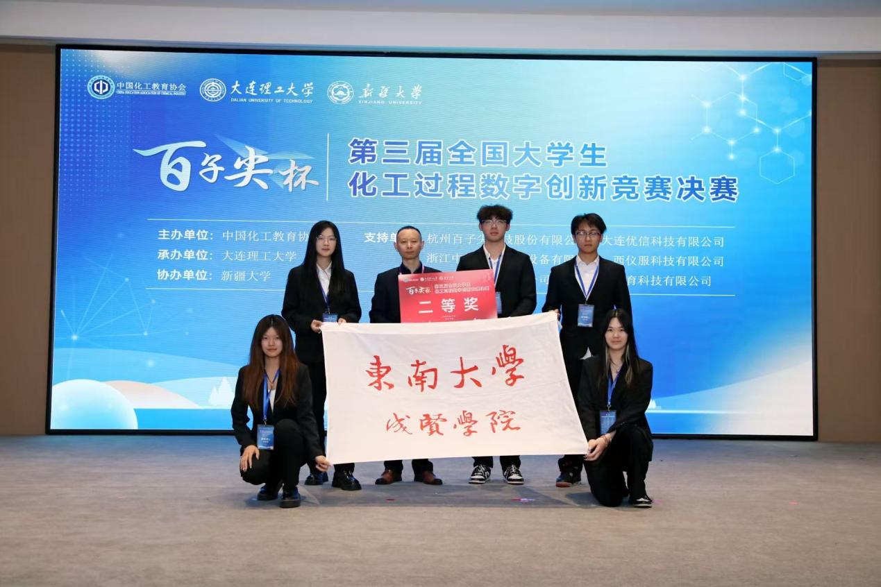 5月23日—25日,由中国化工教育协会主办、大连理工大学承办、新疆大学协办的“百子尖杯”第三届全国大学生化工过程数字创新竞赛全国总决赛在大连举办。大赛共吸引全国120所高校队伍参赛,经过提交作品、专家网评,最终本科生有58支队伍进入全国总决赛。桃子视频 制药与化学工程学院的“戊问烯东队”团队通过前期线上作品盲审初赛,脱颖而出进入决赛。经过现场小组决赛的激烈角逐,最终凭借优异的设计作品和精彩的答辩进入总决赛,获得全国二等奖。该团队成员王星宇、郑怡君、邵锦阳、魏佳乐、周新冉五位同学均来自23级功能材料专业。