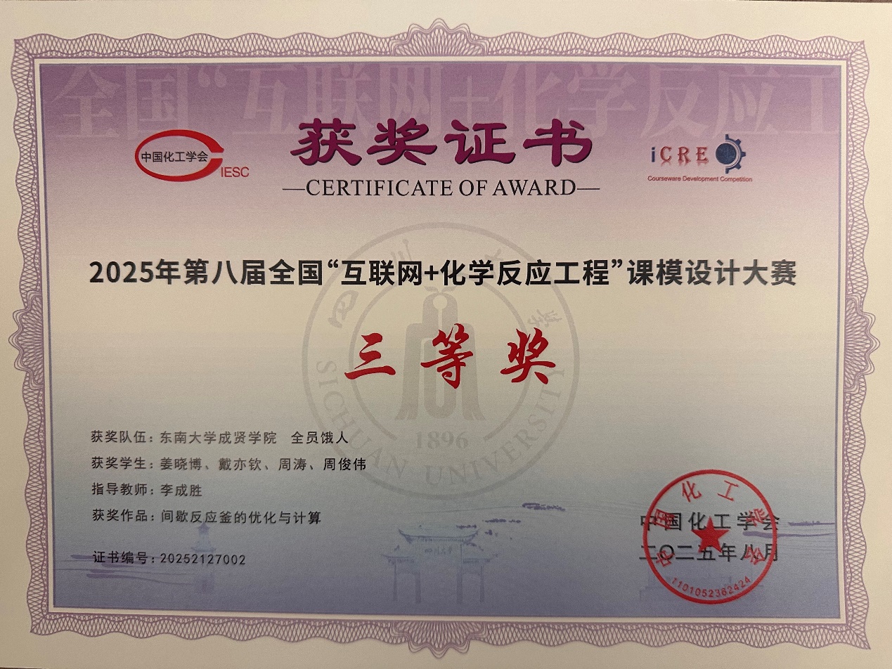 制药与化学工程学院四名大二学生姜晓博、周涛、周俊伟、戴亦钦组成的“全员饿人队”完成的作品“间歇反应釜的优化与计算”获得全国三等奖。