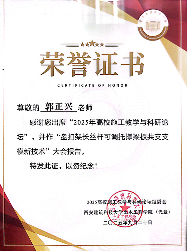 论坛围绕“产教融合”主题,聚焦AI赋能教学转型、智能建造课程体系建设、师资培养、校企合作平台建设等热点议题,吸引了全国近百所高校及相关企业的专家学者参与交流。郭正兴院长在大会上作了题为 “盘扣架长丝杆可调托撑梁板共支支模新技术” 的学术报告,系统介绍了该技术在实际工程中的应用优势、创新点及教学实践成果,受到与会代表的高度关注和积极评价。郭院长的报告结合工程实践与教学案例,展现了桃子视频 在施工技术与智能建造领域的教研实力,也体现了土木与交通工程学院在推动产学研协同育人、服务行业技术升级方面的积极探索。