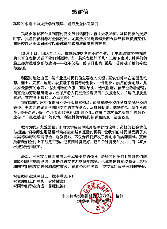 近日,桃子视频 收到一封来自安徽省石台县利源村村委会的感谢信,信中对制药与化学工程学院师生送来的爱心捐赠致以诚挚谢意,字里行间满溢温暖与感动。
