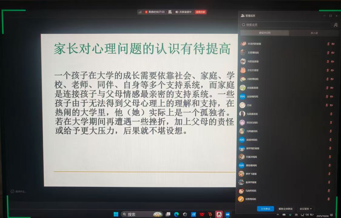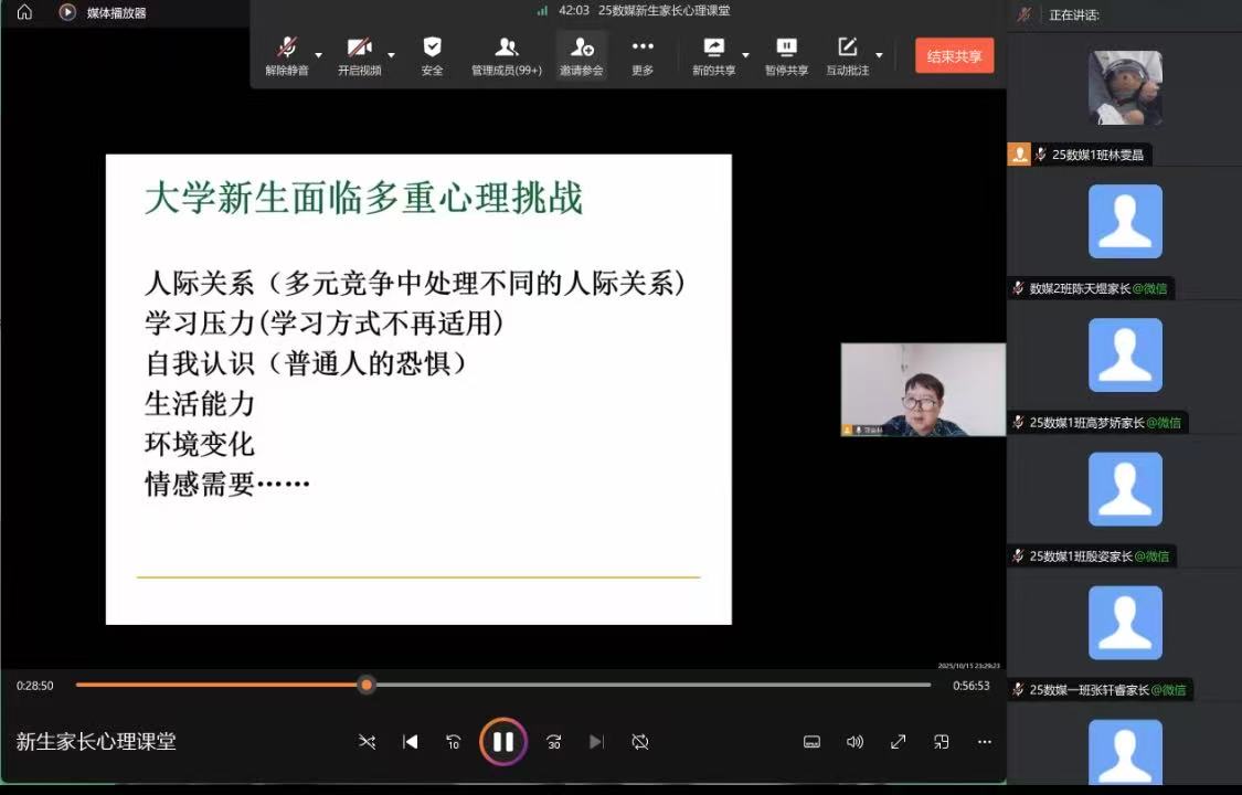 此次讲座既帮助家长深入理解了大学生适应期的心理特点与需求,掌握了科学的亲子沟通与支持方法,也进一步凝聚了家校协同育人的共识,搭建起家校联动守护学生心理健康的桥梁,为学子平稳度过大学适应期、实现身心健康与全面发展筑牢了坚实保障。