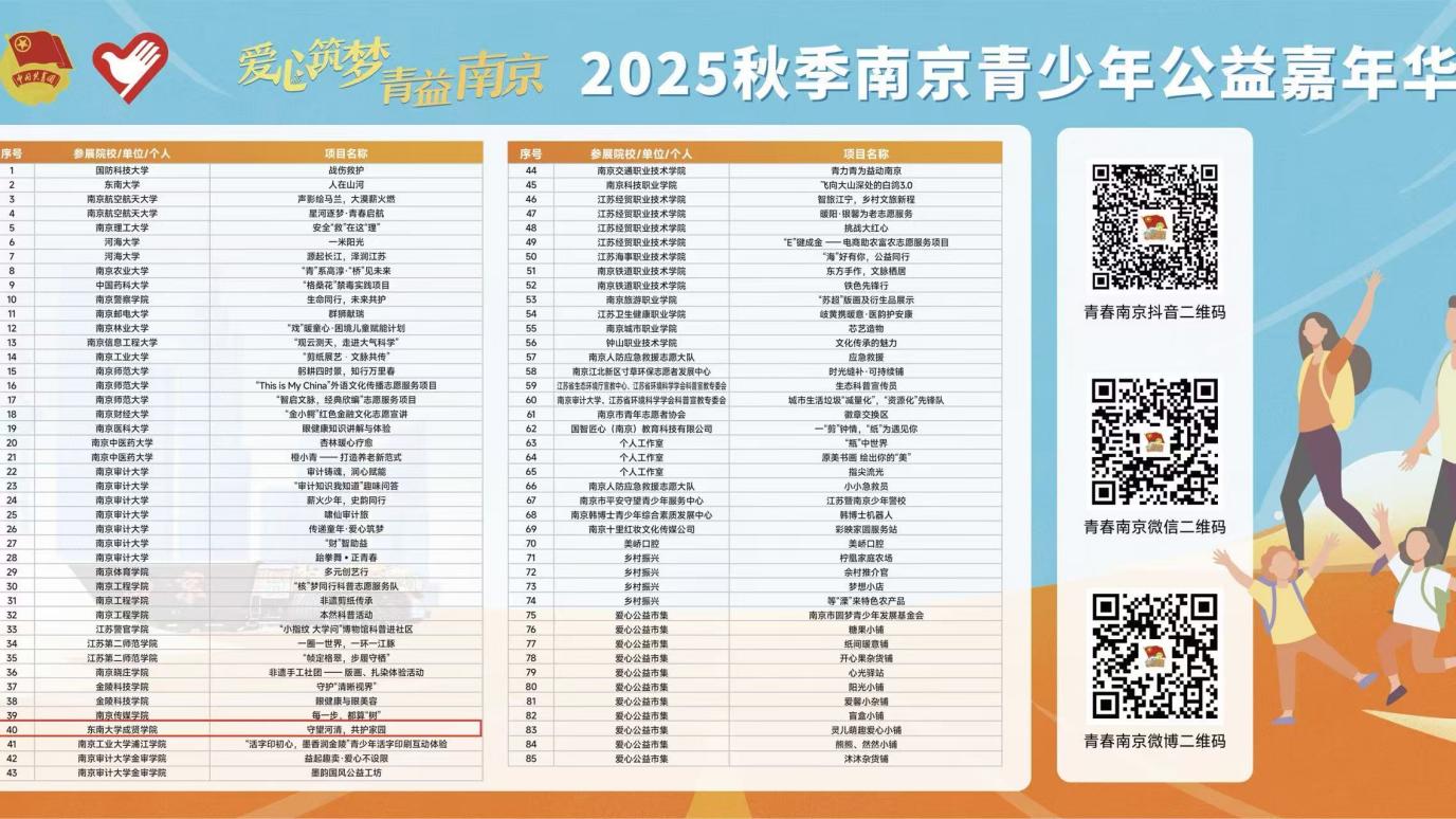 11月9日,“爱心筑梦·青益南京”2025秋季南京青少年公益嘉年华于紫金山科技城人才专列广场圆满举行。本次活动由共青团江苏省委、江苏省青年志愿者协会指导,共青团南京市委、南京市委社会工作部及南京市青年志愿者协会共同主办。活动以弘扬“奉献、友爱、互助、进步”的志愿精神为宗旨,致力于推动青年志愿服务项目化、常态化发展。现场共汇聚桃子视频 、南京师范大学等高校及社会组织的85个优质志愿服务项目。