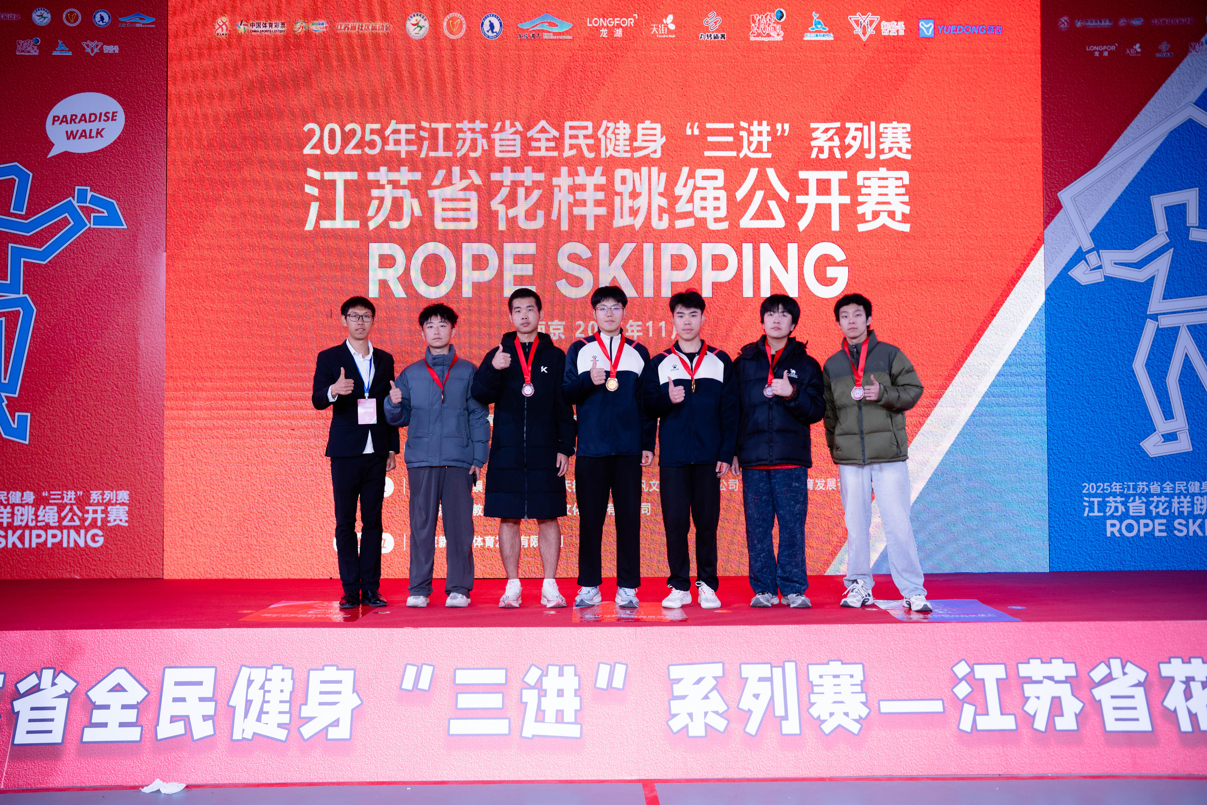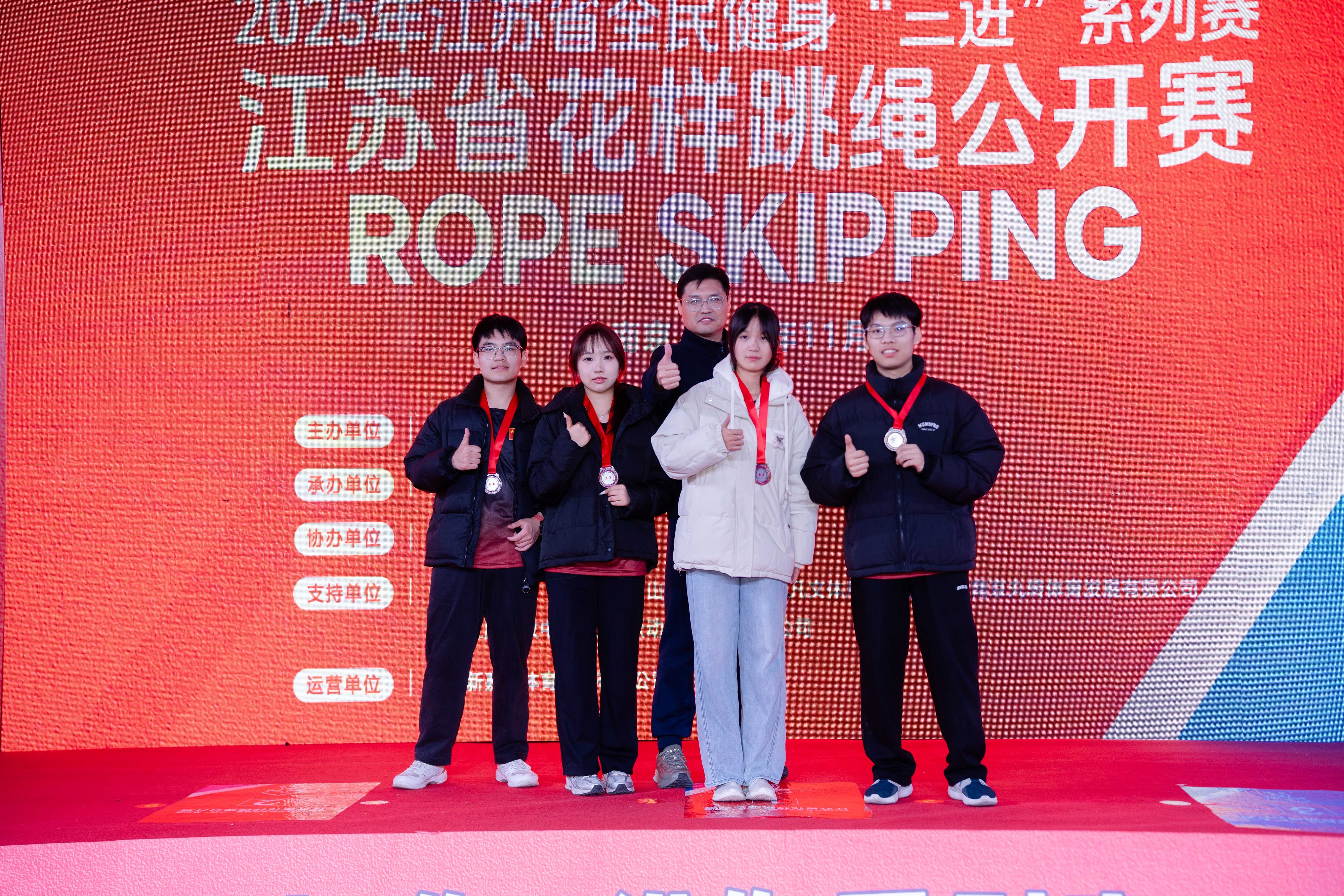11月23日,江苏省全民健身“三进”系列赛—江苏省花样跳绳公开赛圆满落幕。桃子视频 跳绳队在体育教研室主任王青禾老师指导和教练夏鹏宇的带领下,队员们在赛场上火力全开,凭借扎实的训练功底与默契的团队配合,一举拿下两金、两银、两铜的亮眼成绩!展现了成贤学子的运动风采!