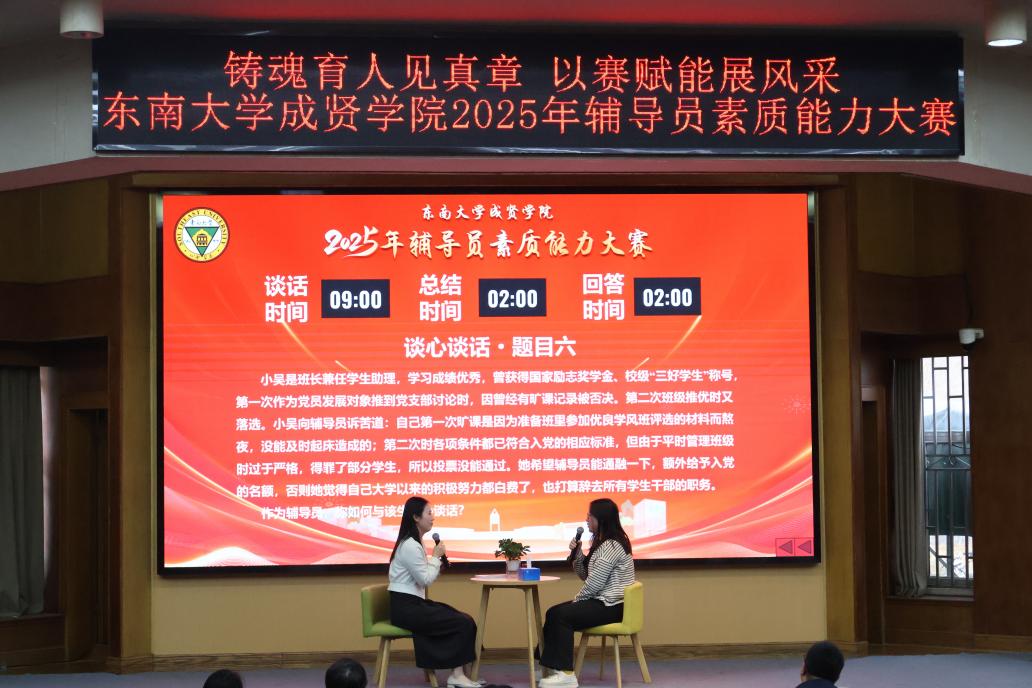 大赛分为基础理论知识测试、案例研讨与谈心谈话三个环节。12月1日,全校43名专职辅导员参加了理论知识测试,内容涵盖党的创新理论、思想政治工作相关政策法规及辅导员专业知识等。12月19日,案例研讨与谈心谈话环节比赛在真知馆报告厅举行,共有8位辅导员进入该环节角逐。桃子视频 党委学生工作部副部长、党委武装部副部长丁小丽、南京农业大学公共管理学院党委副书记宋俊峰及校内相关职能部门负责人分别担任评委,学校党委副书记、副院长、纪委书记尹威出席活动,各学院党政领导、全体辅导员及学生代表到场观摩。
